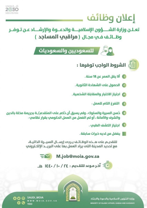 O Xrhsths وزارة الشؤون الإسلامية Sto Twitter تعلن وزارة الشؤون الإسلامية عن توفر وظائف في مجال الدعوة مراقبي المساجد حراس الأمن وللتقديم على هذه الوظائف يرجى إرسال السيرة الذاتية مع تحديد المدينة